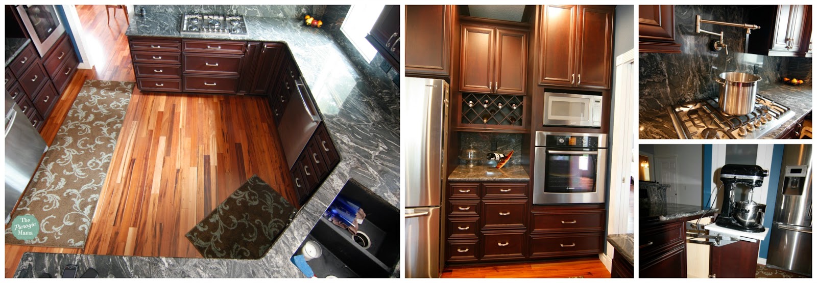 An overview of the counter tops // my favorite wall featuring the best oven of all time and my wine bar // an over the cook top faucet (perfect for filling my huge pot!) // a pop up stand for my KitchenAid mixer so that it doesn't have to sit on top of the counter all the time.
